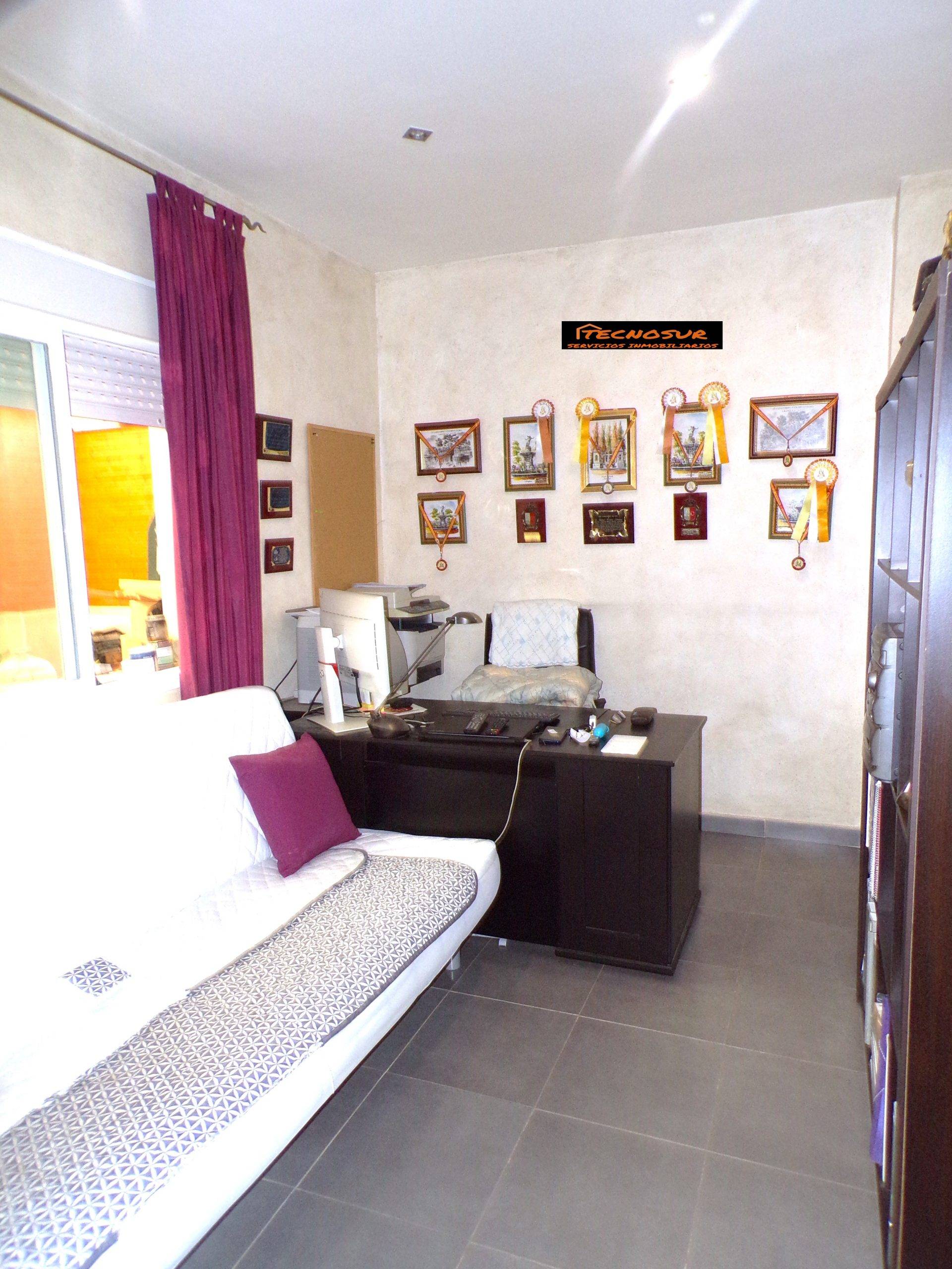 En planta baja, nos encontramos con un Salón ampliado de 36 m2 con cocina en office, con muebles de formica y equipada, un aseo de cortesía, y dormitorio habilitado como despacho, acceso al garaje para un coche, y salida al patio de 45 m2, el cual está alicatado, con jardineras, además de tener una estancia de obra de unos 12 m2.
