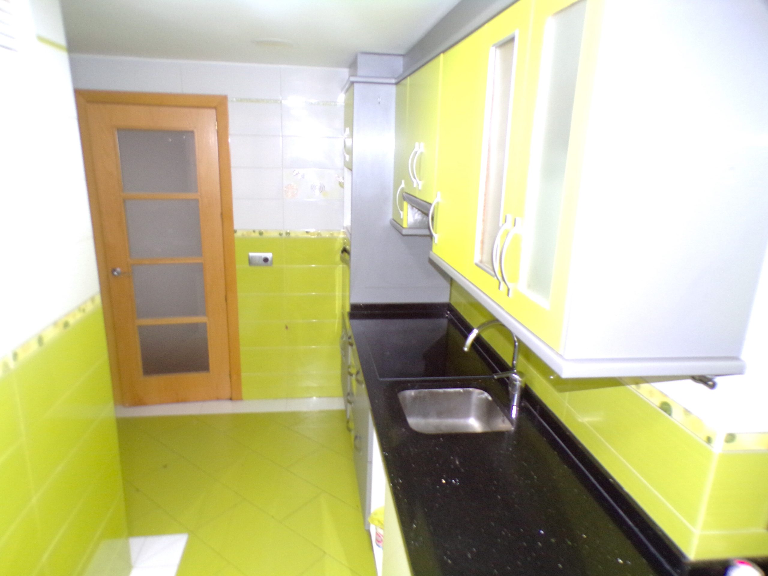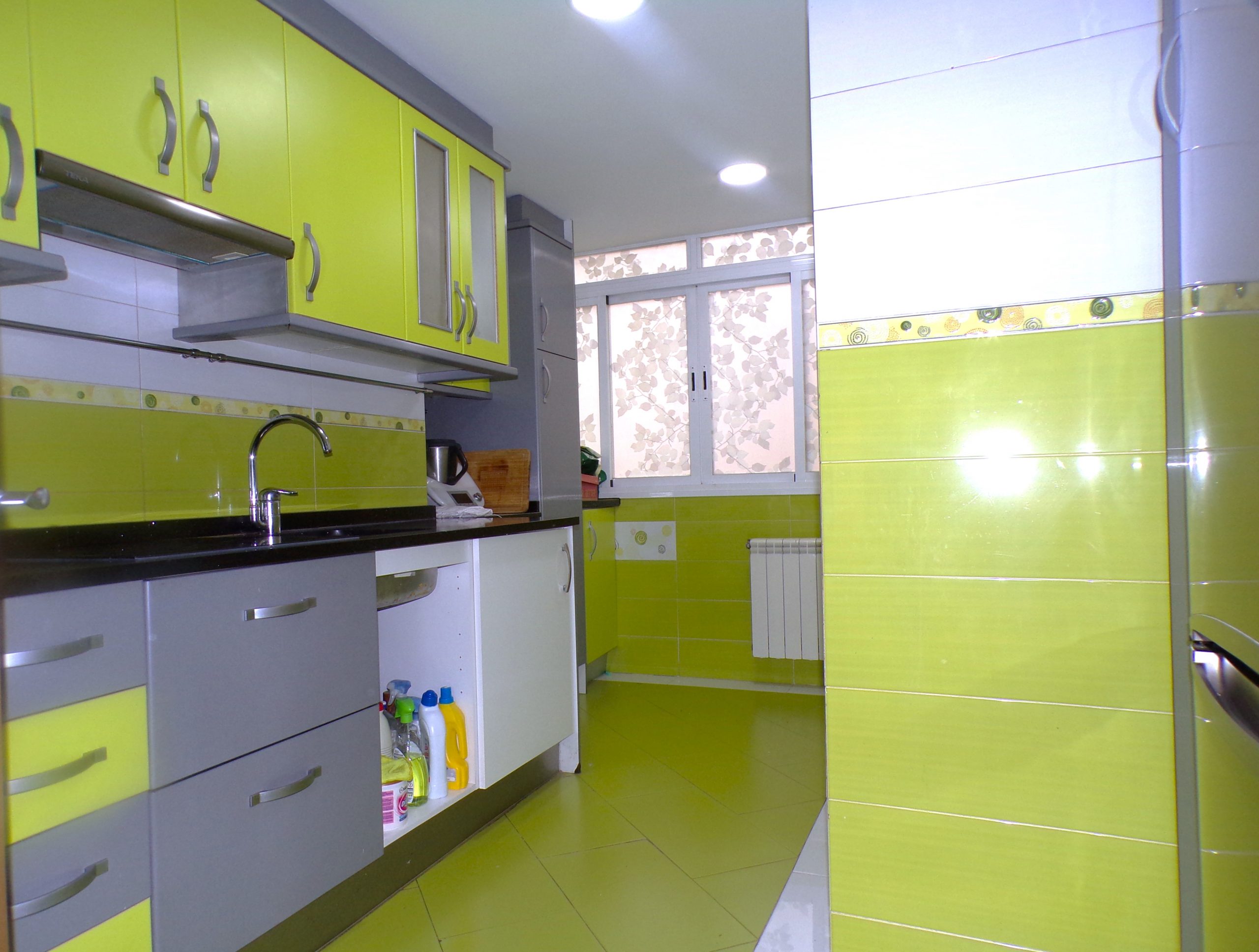 La cocina esta amueblada con muebles de formica. A la cocina se le han añadido los metros de la terraza que venía con la distribución original.